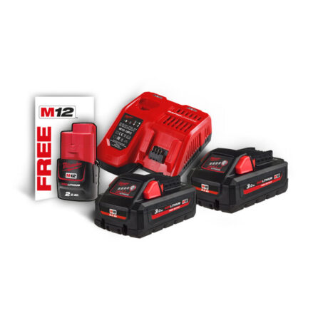 Milwaukee M18™ HIGH OUTPUT™ batteri og laderpakke inneholder to M18 HB3.0 3.0 Ah batterier, ett M12 B2 2.0 Ah batteri og en M12-M18 hurtiglader (M12 18 FC). Pakken gir økt ytelse og rask lading for både M12- og M18-verktøy.