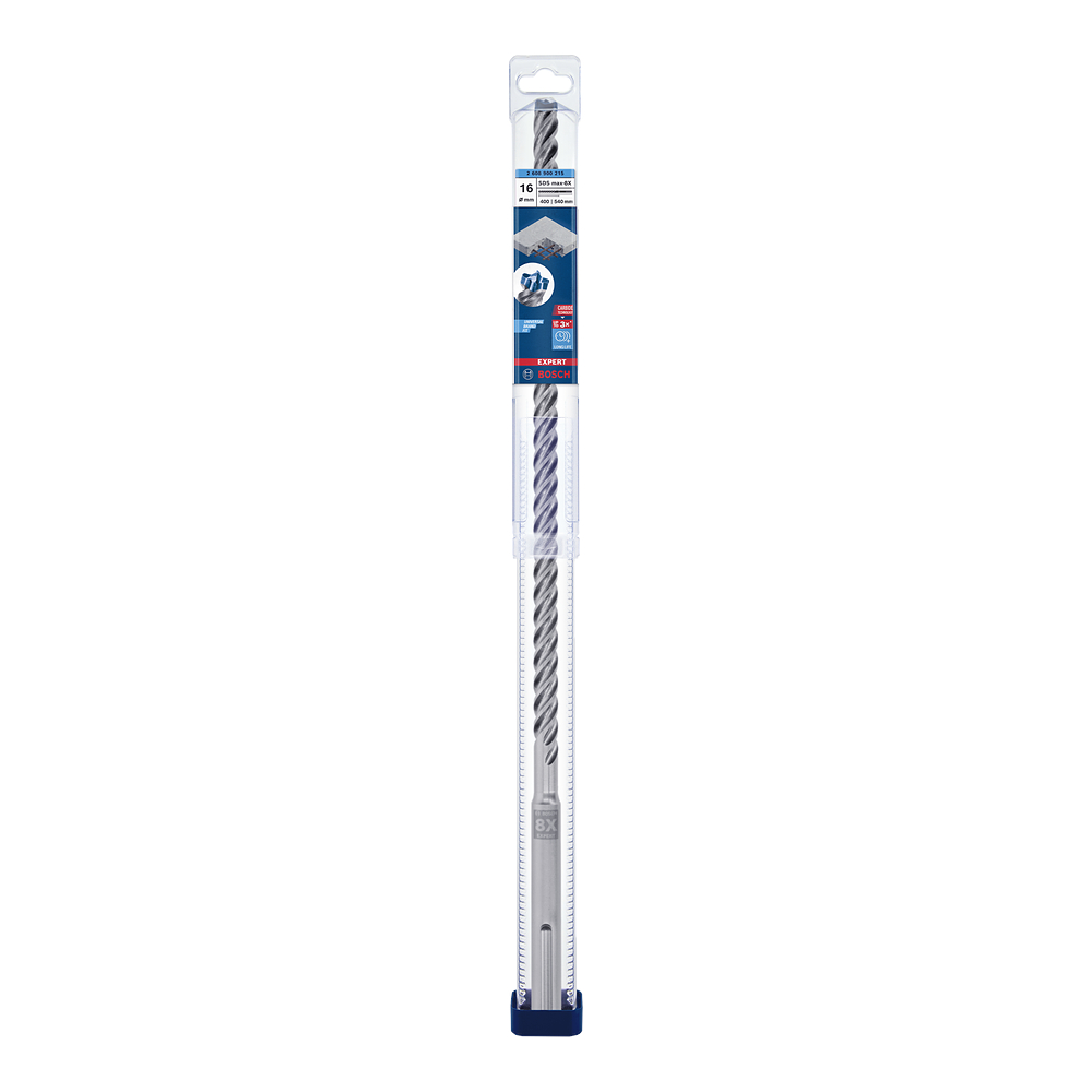 Bosch EXPERT SDS max-8X hammerbor 16 x 400 x 540 mm er utviklet for krevende boreoppgaver i betong, inkludert armert betong. Med Bosch Carbide Technology og et hardmetallhode med fire skjær gir boret høy slitestyrke og lang levetid. Den solide borspissen og den spesielle Bosch-sveiseprosessen gir svært god motstandsdyktighet og stabilitet under boring, selv ved gjennomslag i armert materiale.