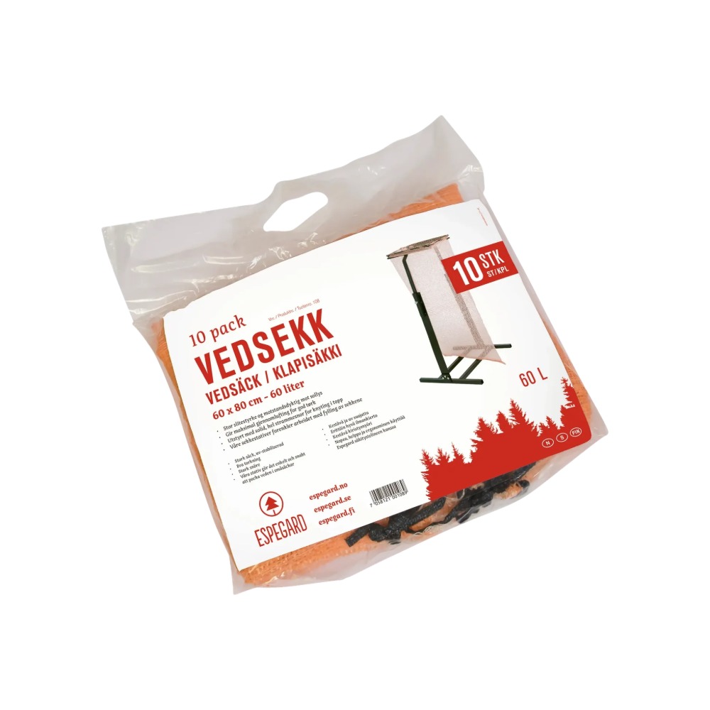 Pakke med 10 stk UV-stabiliserte 60L-sekker av høy kvalitet, for engangsbruk. Med hel snor. Ved i 60-liters småsekk er en billig måte å emballere på, som forenkler håndtering og transport. Veden tørker godt og kvaliteten på veden er lett synlig gjennom nettingen. Sekkene testes og kontrolleres før salg. Forskjellige stativer tilpasset 60-sekker finnes, for enklere pakking av ved.