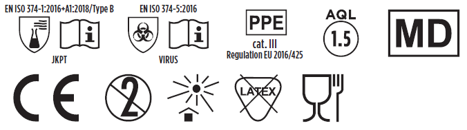 - Oppfyller vernekrav: EN 421, EN ISO 21420, EN ISO 374-1, EN ISO 374-5