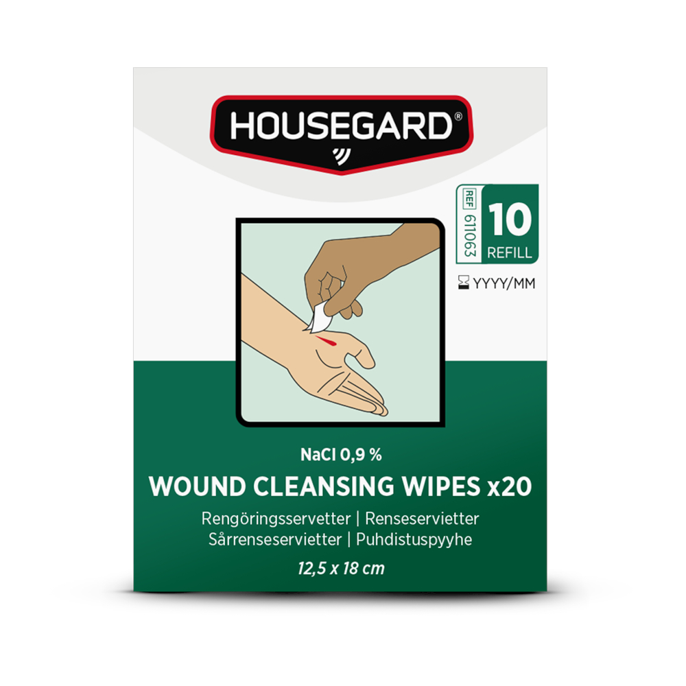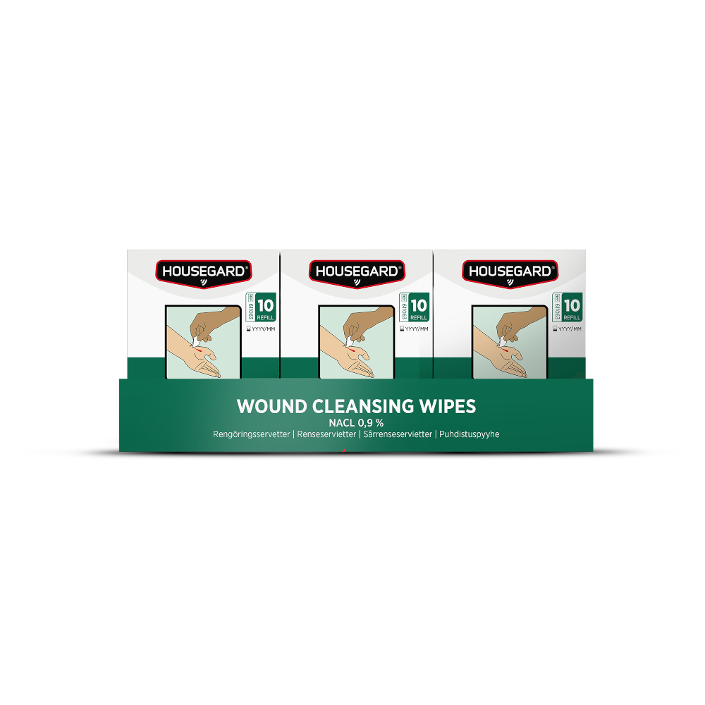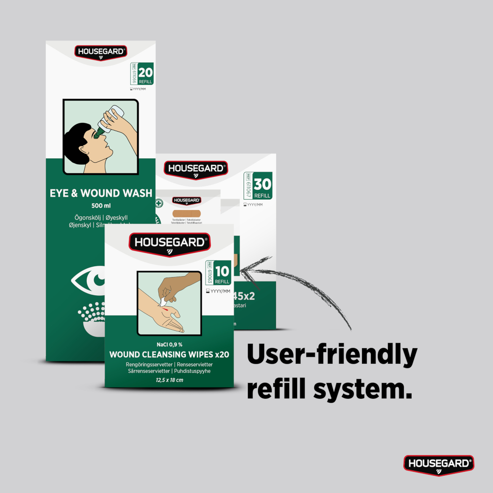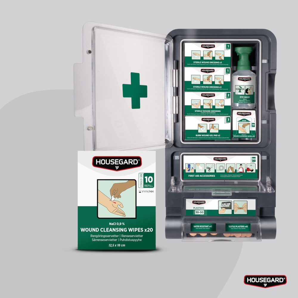 De sterile serviettene leveres som refill til Housegards førstehjelpsstasjoner og er kompatible med andre fabrikater.