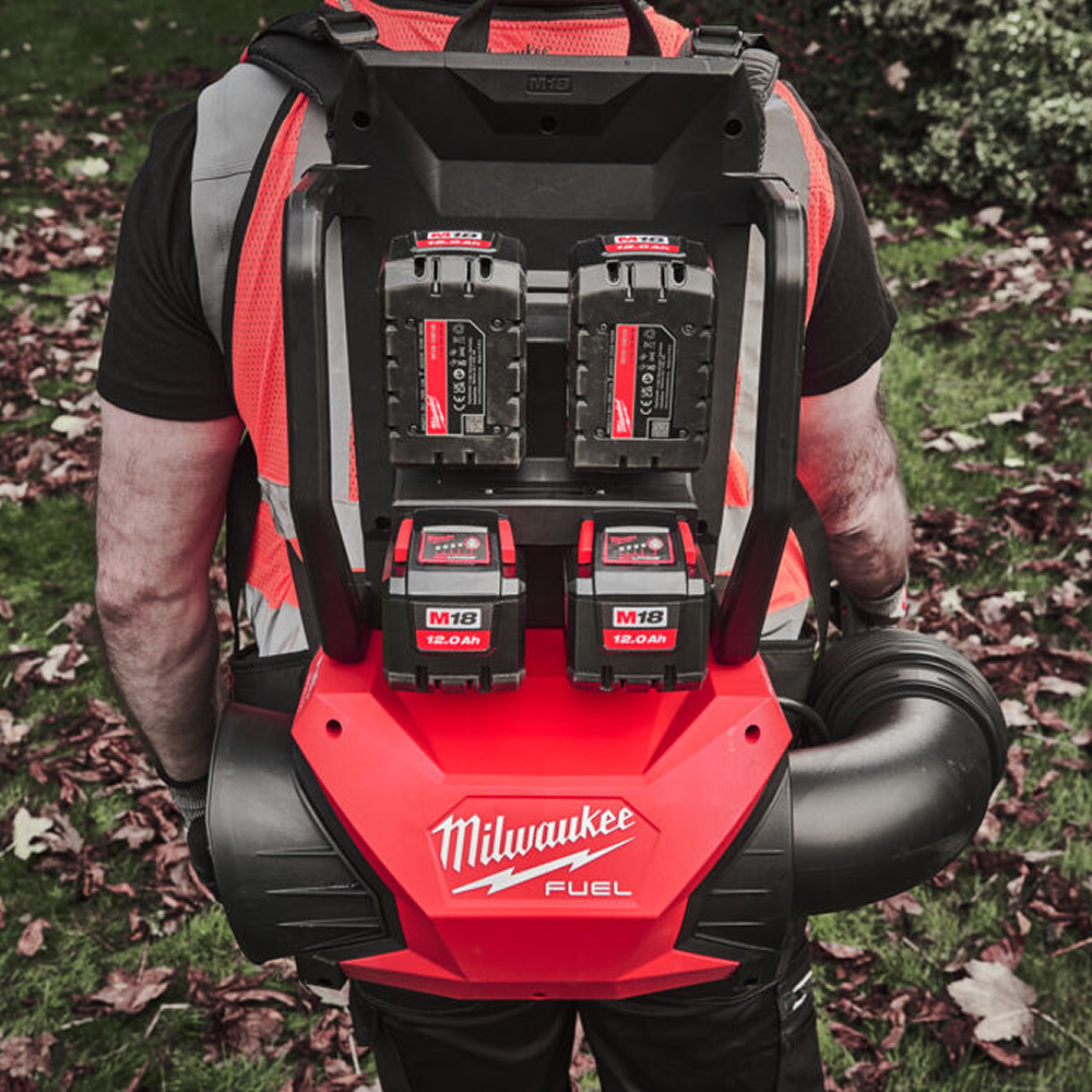Milwaukee M18 FUEL™ F2BPB-124 ryggsekkblåser med to batterier gir konstant blåsekraft på 20,5 N gjennom hele batteriets utlading. Den ergonomiske ryggplaten, justerbare skulderstropper og muligheten for opptil fire batterispor sikrer komfort og lang driftstid. Med høyt luftvolum og hastighet, variabel regulering og utskiftbare munnstykker er dette et allsidig verktøy for krevende oppgaver. Den børsteløse POWERSTATE™-motoren, REDLITHIUM™-batteriet og REDLINK PLUS™-elektronikken gir høy ytelse, driftstid og levetid. Fleksibelt system som fungerer med alle MILWAUKEE® M18™ batterier.