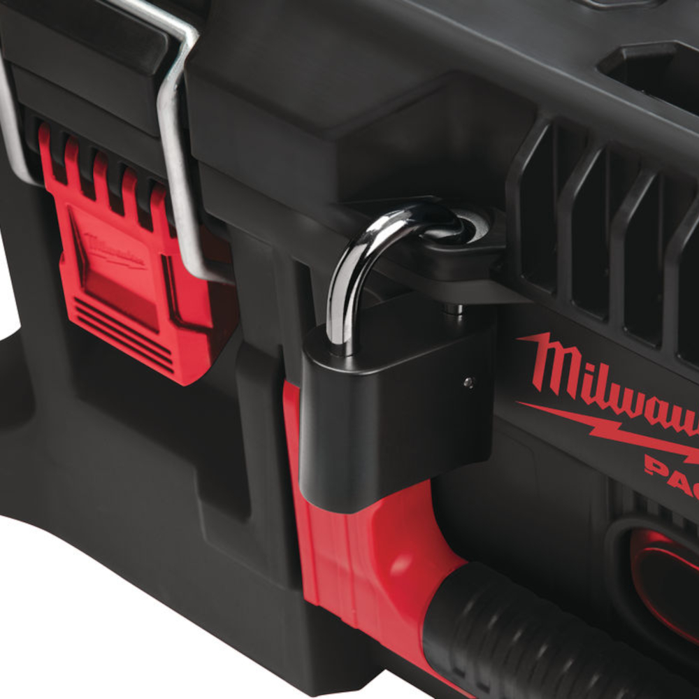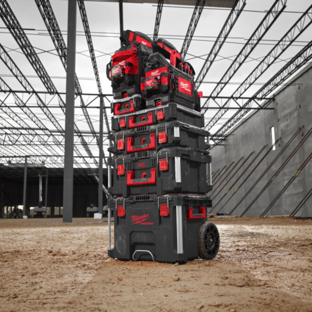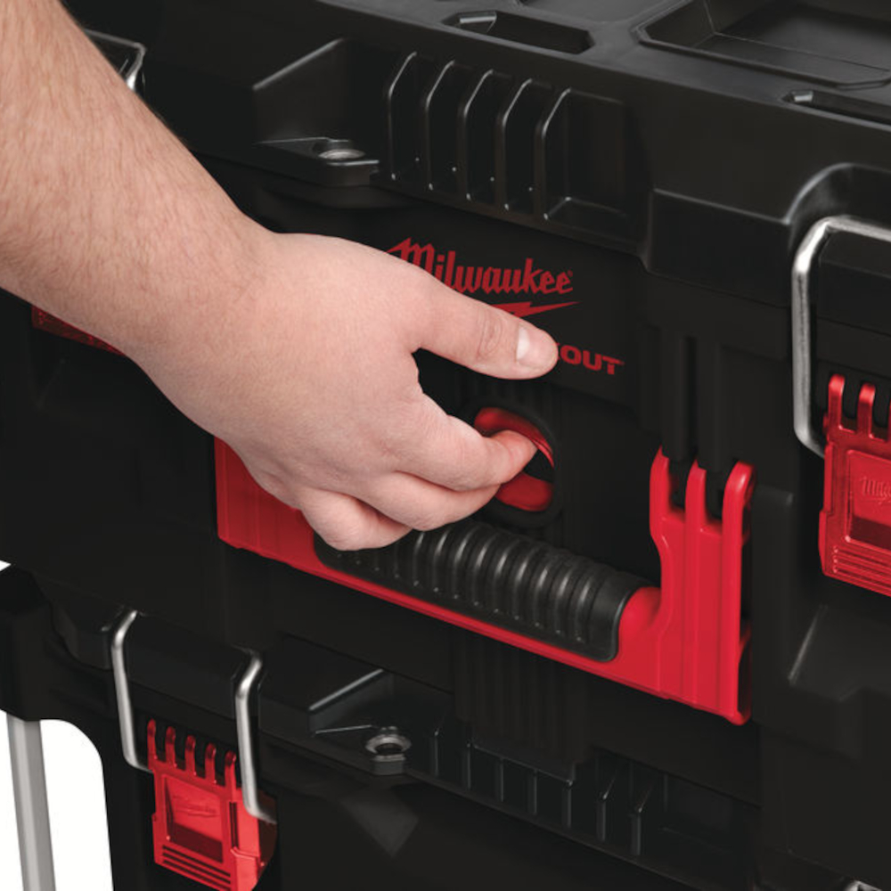MILWAUKEE PACKOUT™ stor koffert er en del av det modulbaserte PACKOUT™-systemet, utviklet for profesjonelle som trenger solid og fleksibel oppbevaring. Kofferten er laget i støtbestandige polymerer og tåler tøffe arbeidsforhold. Med IP65-klassifisering er innholdet beskyttet mot støv og vann, og metallforsterkede hjørner og låser gir ekstra styrke. Inne i kofferten finner du bakker til tilbehør og egen plass for ONE-KEY™ TICK™ sporingsenhet. Det metallforsterkede håndtaket gjør transporten enkel, selv når kofferten er fullastet.