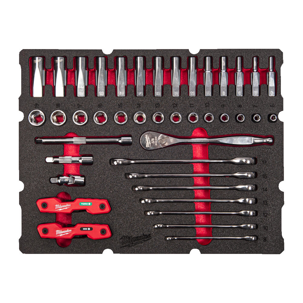 Milwaukee skralle 3/8″ og skrallenøkkelsett med 55 deler gir bedre tilgang med en 2,5° buesving og en skrallemekanisme med 90 tenner for trange steder. Fire flate sider forhindrer rulling og gir godt grep, mens MAX BITE™-designet øker dreiemomentet og forbedrer grepet på avrundede bolter. Settets skuminnlegg sikrer holdbarhet og enkel størrelsesidentifikasjon, med en rød bakgrunn for rask oversikt over manglende deler. Ergonomisk håndtak og sammenleggbare sekskant- og torx-nøkler gir komfortabel bruk og praktisk oppbevaring.