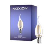 Noxion Lucent LED E14 Böjd topp Mignon filament klar 2.5W 250lm – 827 ekstra varm hvit er en klar filamentpære med E14-sokkel som erstatter 25W. Den gir 250 lumen med 2700K ekstra varm hvit fargetemperatur for et behagelig lys.