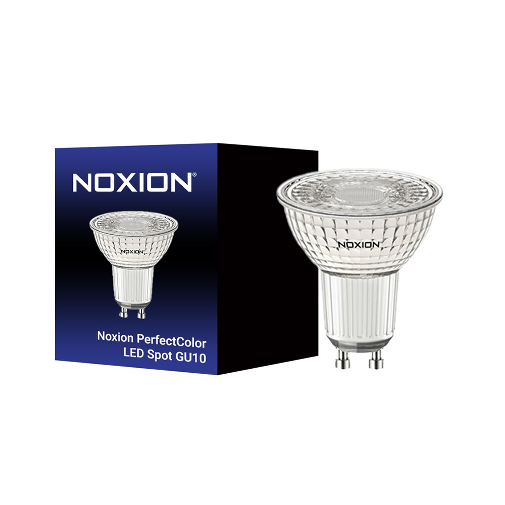 Noxion PerfectColor LED spot GU10 PAR16 4W gir 345 lumen med 3000K varm hvit og svært høy fargegjengivelse. Den er dimbar, har 36° lysspredning og erstatter en tradisjonell 50W GU10-spot.