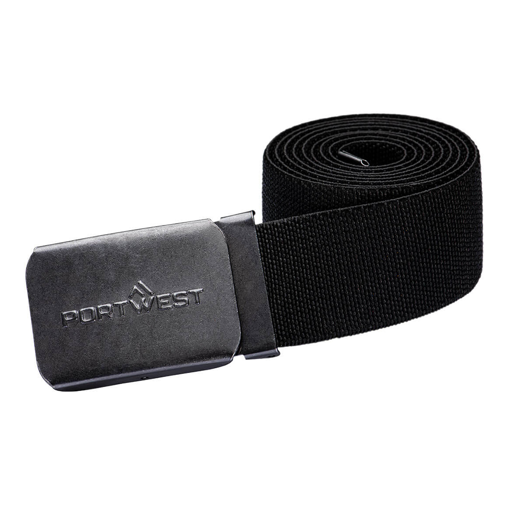 PORTWEST C105 elastisk arbeidsbelte i svart er et justerbart og funksjonelt belte utviklet for daglig bruk. Beltet er konstruert for å tåle slitasje over tid og har en sterk, men enkel spenne som gjør det raskt å ta av og på. Den elastiske konstruksjonen gir god komfort og fleksibilitet, og beltet passer til alle Portwest-bukser.