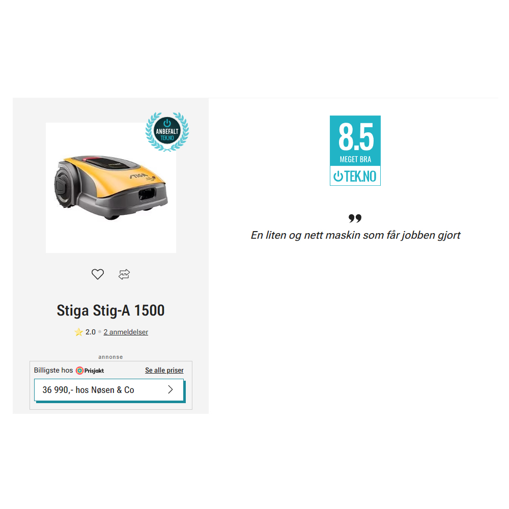 STIGA A 1500 drives av et integrert STIGA ePower batteri som kan vedlikeholde plenen din på kun 2 klippeøkter om dagen. Neste klippeøkt vil alltid starte der det forrige sluttet, alle soner i hagen blir regelmessig klippet, ingen uklippede områder. For å bevare plenens helse anbefaler vi å planlegge for kun 2 vedlikeholds økter om dagen, men hvordan du planlegger klippeøktene er fleksibelt og ditt valg.