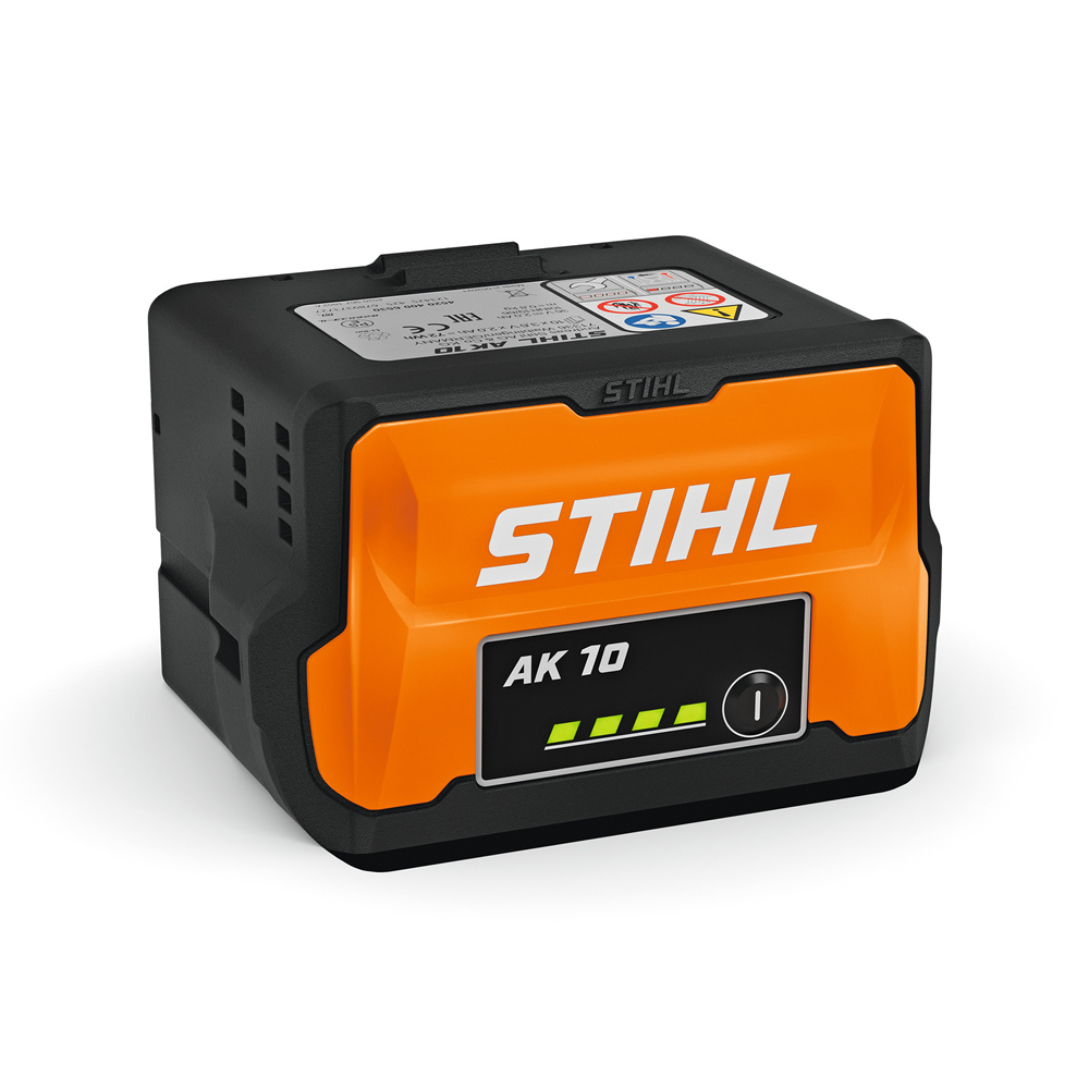 STIHL batteri AK 10 er et kompakt Lithium-Ion batteri til STIHL AK-system med en batterispenning på 36 V og et energiinnhold på 72 Wh. Batteriets driftstid avhenger av maskin og bruksområde, og den innebygde ladeindikatoren med fire LED-lys gjør det enkelt å følge med på kapasiteten. Batteriet er kompatibelt med laderne AL 101, AL 300 og AL 500.
